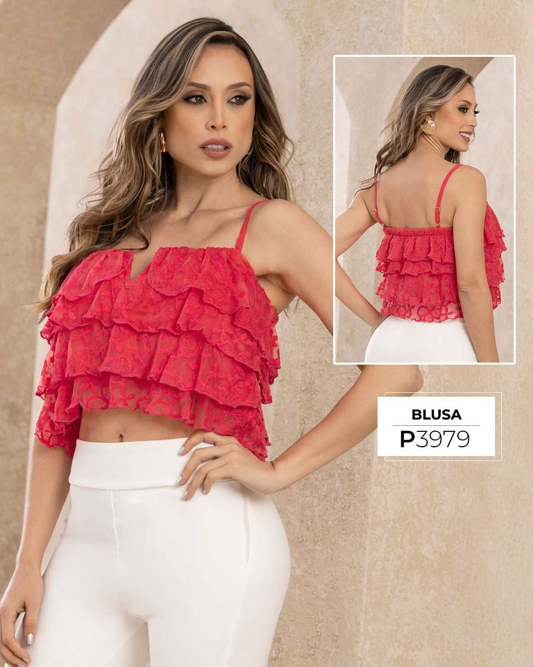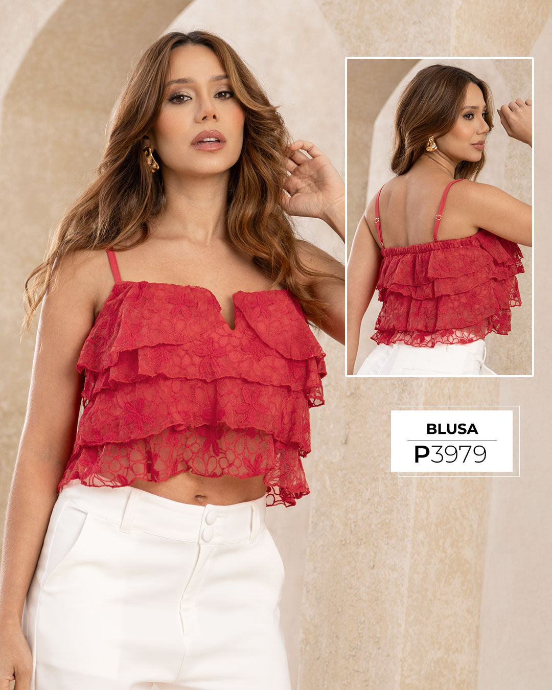 P3979 BLUSA TULL BORDADO CORAL OSCURO