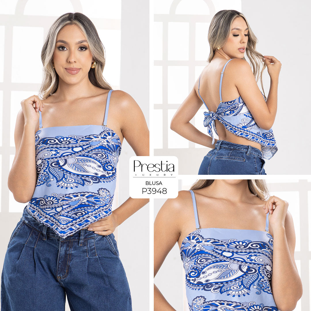 Blusa: Tela plano satin mate Color marfil estampado Estilo Pañuelo Tiras delgadas ajustables Espalda descubierta...
